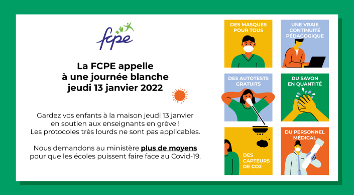 Membres de la communauté éducative, les parents d'élèves de la FCPE ont décidé de se joindre à la journée nationale de mobilisation du jeudi 13 janvier prochain, en appelant les parents à ne pas envoyer leurs enfants à l'école ce jour-là. Il est grand temps de mettre la personne de l’enfant et ce qu’il vit dans le protocole d’isolement au centre de l’échiquier.