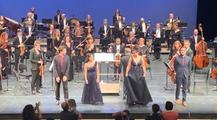 La « Danse bacchanale de Samson et Dalila » de Saint Saëns ouvre le bal. Le public est attentif, un peu distant. Mais le chef d'orchestre, Pierre-Yves Gronier, sait y faire. Il parvient progressivement à « chauffer » la salle ! Au fur et à mesure que les « tubes » de l'opéra sont présentés aux spectateurs, un lien se tisse entre la cinquantaine de musiciens, les quatre chanteurs et le public. Les enfants, surtout, ne font pas semblant. Ils n'hésitent pas à se lâcher, à rire au « Papageno et Papagena » de la Flûte enchantée de Mozart ou au « Duo de la mouche » d'Orphée aux Enfers d'Offenbach. Mieux, ils dansent et tapent dans leurs mains en entendant l'« Air du Brésilien » de La Vie parisienne d'Offenbach. L'ambiance est survoltée, le public est au diapason de la musique jouée, et n'hésite pas à remplacer les chœurs du « Toréador » du Carmen de Bizet. Incroyable, et émouvant, de voir dans les loges ces petits bouts de choux qui n'ont jamais vu de spectacle d'opéra s'amuser autant, applaudir à tout rompre, et même danser !
